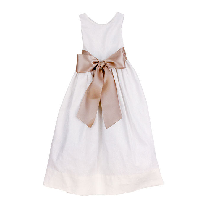 Linen has been treasured for centuries for its natural elegance, breathability, and beautiful texture that only improves with wear. The empire waist creates a sophisticated silhouette that's both comfortable and flattering, while the whisper-white shade offers versatile styling options for any special occasion. Perfect for garden parties, beach celebrations, portraits, christenings, or summer weddings. Pair with white sandals and delicate accessories for a fresh, refined look, or add a pop of color with a coordinating sash or cardigan.