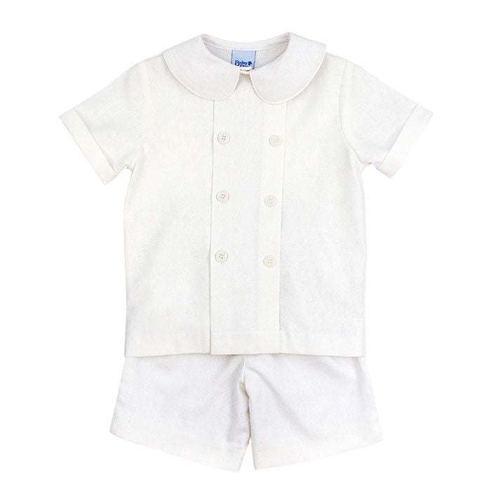 Linen has been treasured for generations for its natural elegance, breathability, and beautiful texture that only improves with wear. This dressy short set is perfect for garden parties, beach weddings, portraits, Easter celebrations, summer events, or any occasion where classic style meets comfort. The whisper-white shade offers versatile styling options and pairs beautifully with dress shoes for formal events or boat shoes for a more relaxed look. A timeless piece that transitions seamlessly from ceremony to celebration.