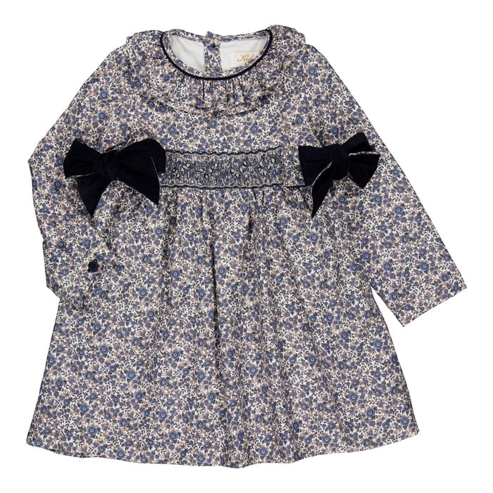 Hand Smocked Navy Print Dress w/ Cord Bows