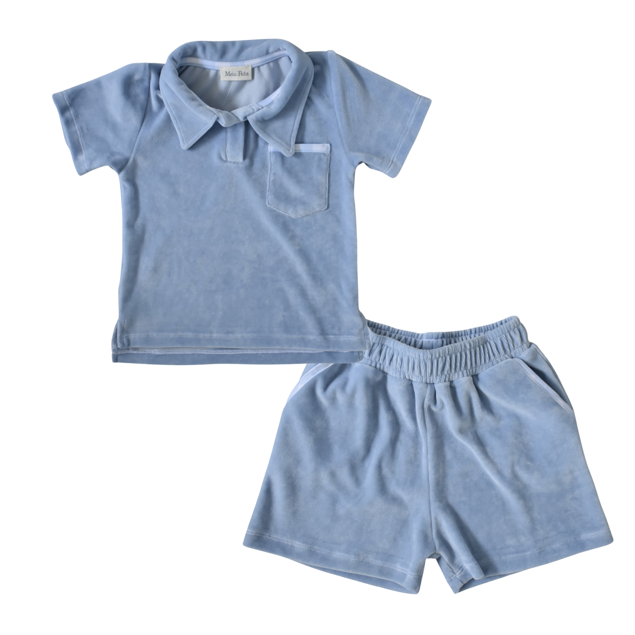 Luxe blue velour short set by Meia Pata. Soft, plush velour fabric in a coordinated two-piece set. Perfect for boys' resort wear, pool cover up, and beach club style. Comfortable and sophisticated.