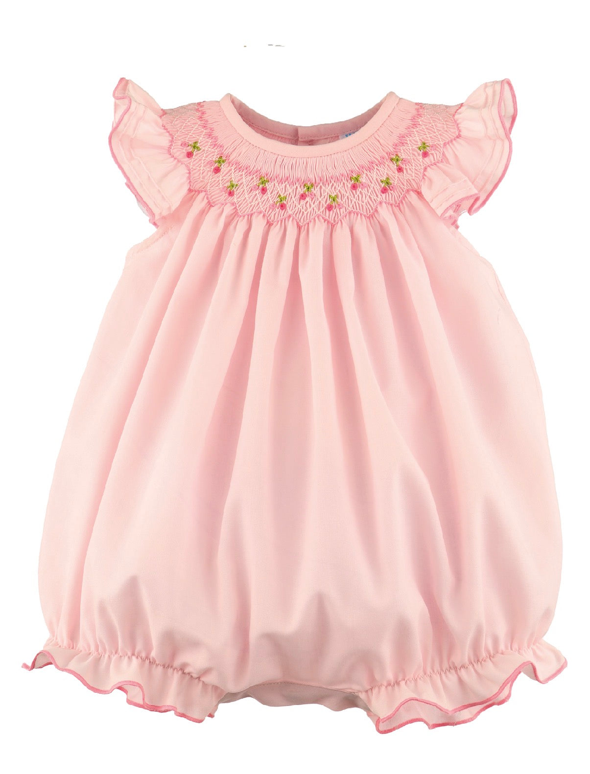 Sweet charming cherries bubble by Luli & Me. Features adorable cherry print on a classic bubble romper. Perfect for baby girls' spring outings, Easter celebrations, and warm weather fun. Comfortable and charming.