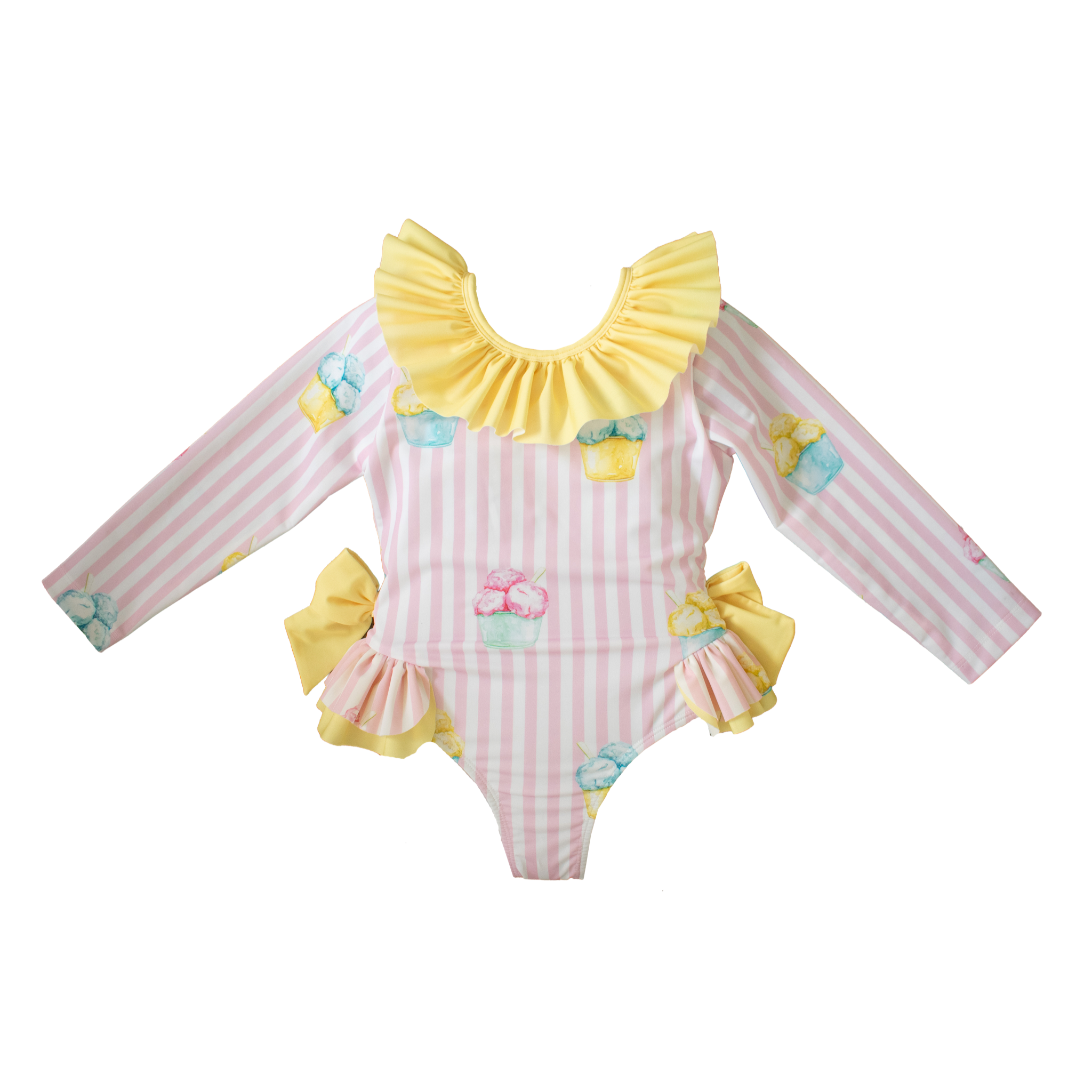 Sweet long sleeve ruffle ice cream swimsuit by Meia Pata. Features adorable ice cream print with playful ruffles and long sleeves for sun protection. Perfect for beach days, pool parties, and summer fun.