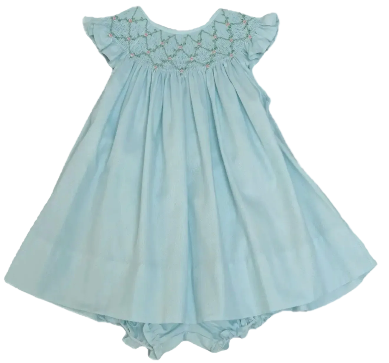 Timeless elegance and exquisite craftsmanship come together in this mint hand smocked bishop dress. The traditional bishop silhouette features intricate hand smocking and delicate detailing, creating an heirloom-quality piece that's perfect for special occasions and treasured celebrations.
