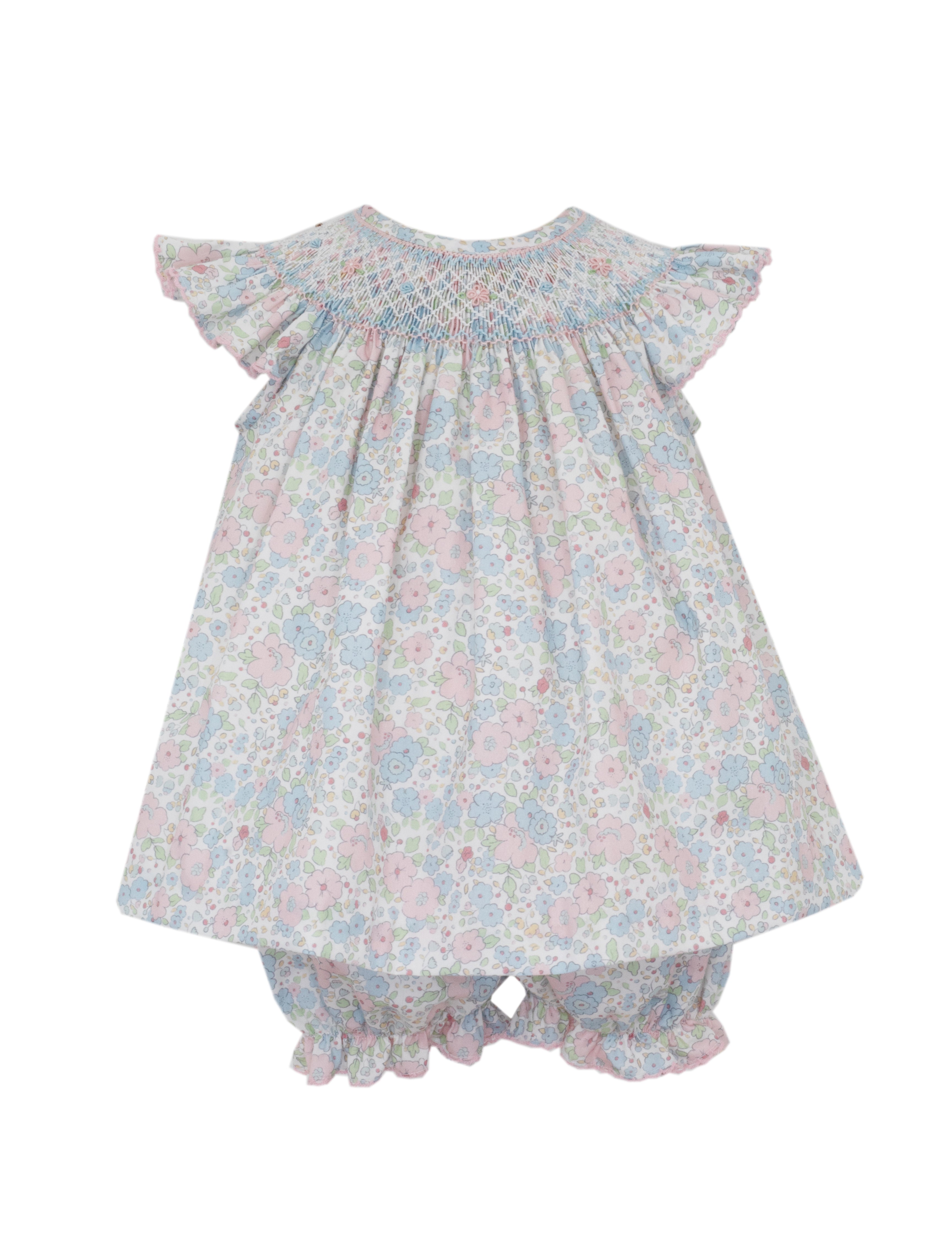 Sweet and timeless, this pink and blue floral bishop bloomer set features classic bishop styling with delicate floral details. The charming color combination and traditional design create a fresh, feminine look that's perfect for special occasions and everyday elegance.