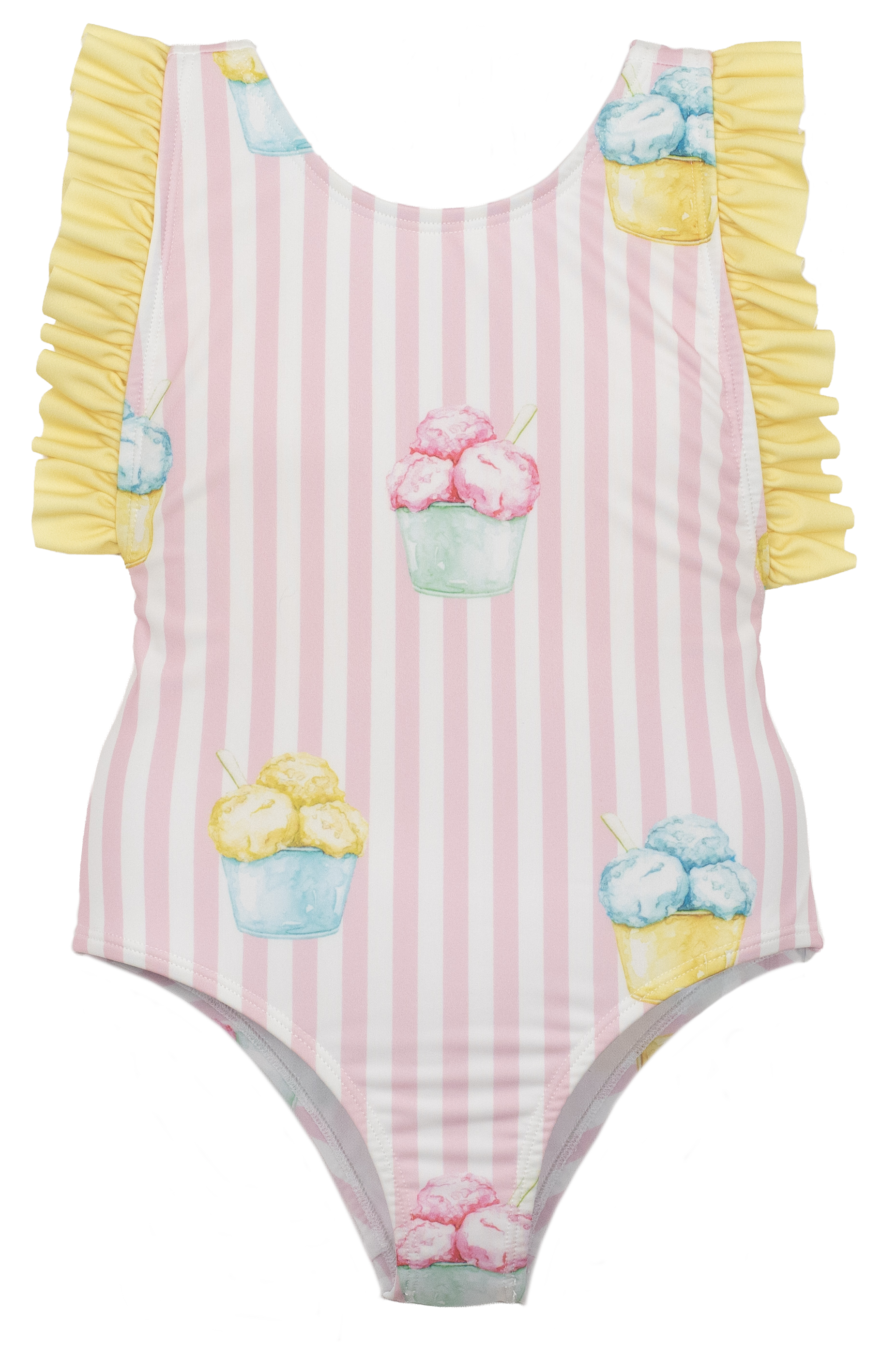 Adorable shoulder ruffle ice cream swimsuit by Meia Pata. Features sweet ice cream print with charming shoulder ruffles. Perfect for summer pool parties, beach days, and ice cream-loving little ones.