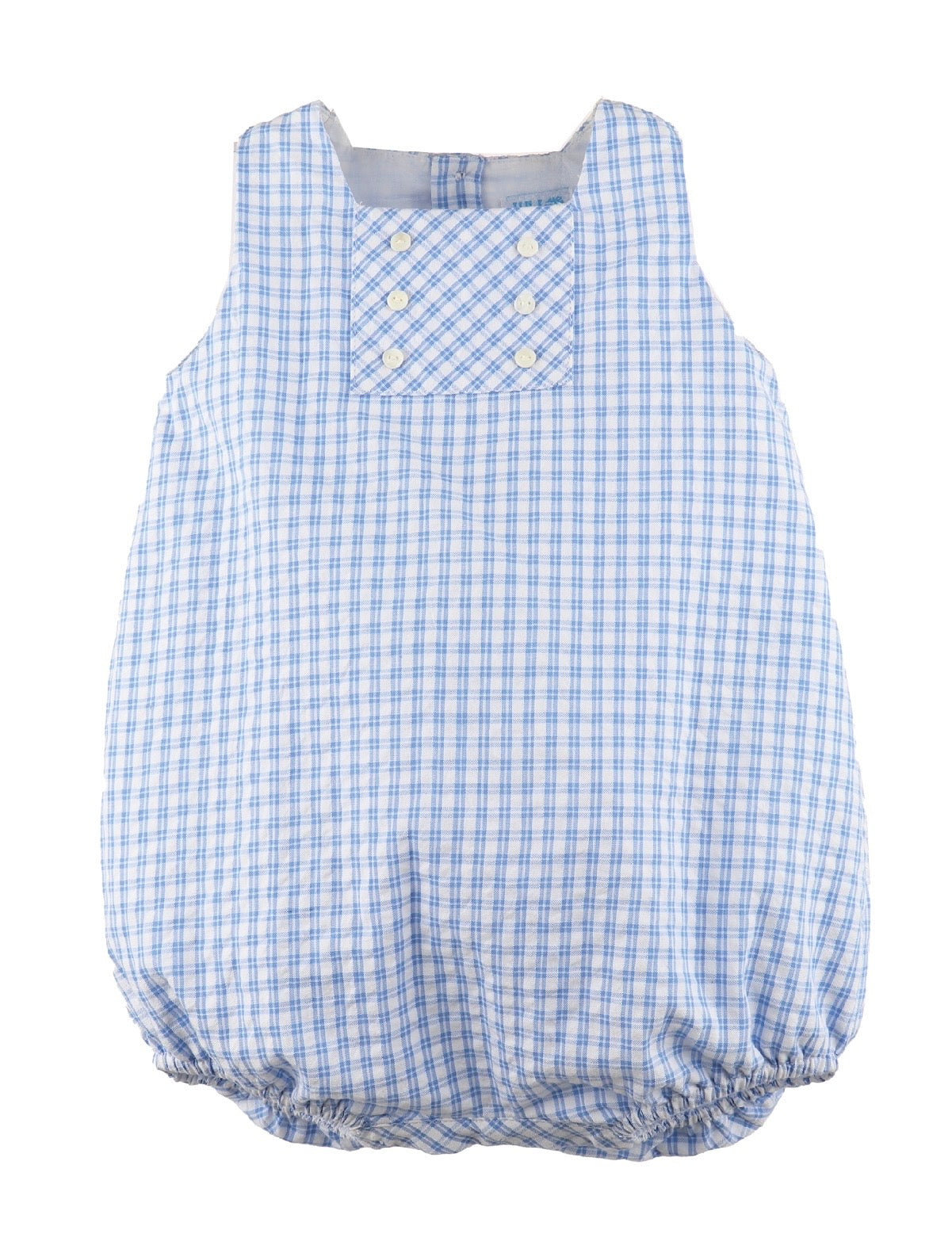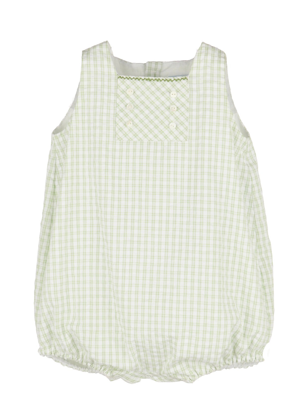 Classic Vichy gingham bubble by Luli & Me. Available in green or blue. Features timeless gingham check pattern in a traditional bubble style. Perfect for baby boys' spring celebrations and Easter egg hunts.